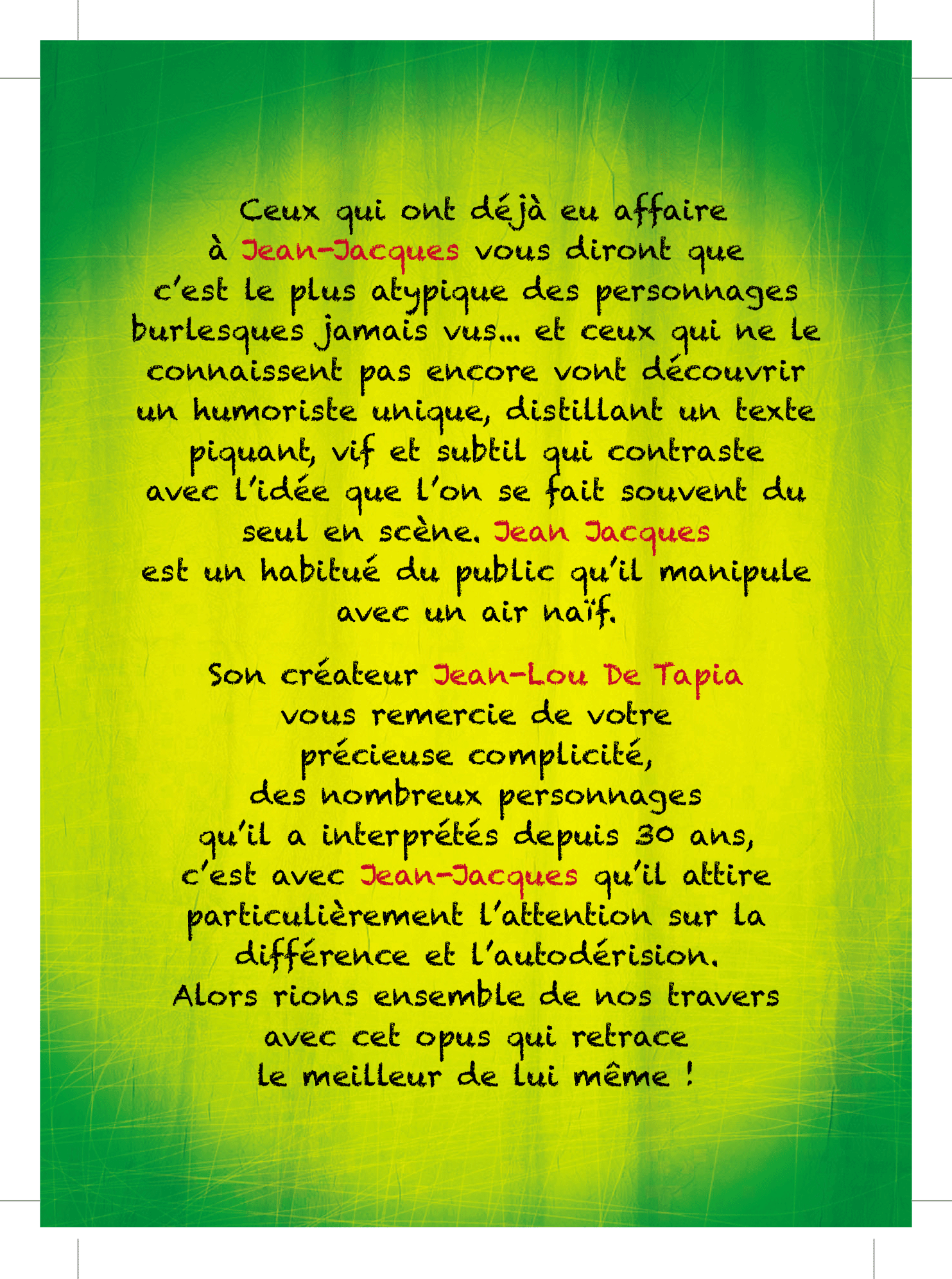 JEAN-JACQUES c’est un grand optimiste, un foutraque malicieux, un loser magnifique qui ne suit aucun courant, il est unique, original, burlesque et incisif ! C’est un vrai seul en scène, Jean-Jacques va vous transporter dans un univers auquel vous ne vous attendiez pas. Le spectacle évoluant en permanence, vous retrouverez les codes du premier opus qui a remporté 17 prix en 12 festivals, ainsi Jean-Jacques vous promet de nouvelles folies !
